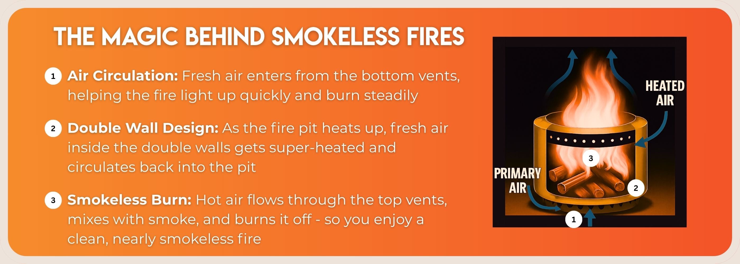 Secondary burn vents in the fire pit enhance combustion by injecting super-heated air which burns off the smoke